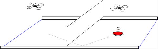 本届挑战赛决赛项目“无人机‘皮球’对抗”借鉴国际空中机器人大赛的比赛内容,起点高,难度大,是对12支参赛队伍的严酷考验。比赛采取对抗赛形式,由裁判员遥控启动iRobot地面机器人自主运动,两队无人机自主识别地面机器人,并对其进行拦截与转向控制,使其进入对方场地,即完成一次“进球”得分。比赛规定在每局一定的时间内“进球”得分多者为获胜队伍。“自主识别皮球对抗”项目是对队员们在视觉处理算法方面的考察。